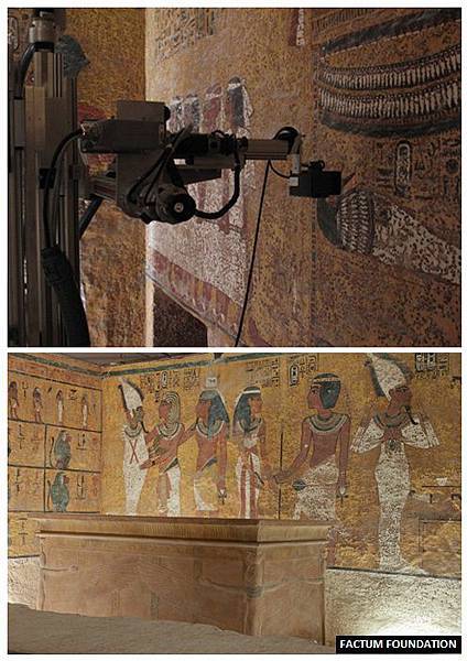 (上圖正在進行雷射掃描,下圖為重製的墓室)根據當初的發現紀錄,法老的墓室幾乎沒有被盜掘者破壞的痕跡,因此許多珍貴的訊息都完全保留下來,而要如何重現這些細節和質感就是個很大的挑戰。