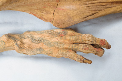 Lady of Cao的屍身以重達12公斤的織品精心包綑了26層,最長的一片超過70公尺並將她繞了48圈。臉上覆蓋一小片綿衣、外面再倒扣一個鍍金銅碗作保護,手臂、手指及腳踝則佈滿刺青(圖三),圖案包括各具象徵意義的蜘蛛、魚、蛇及夜行動動;這也是莫希文化首見死者紋身的墓葬。