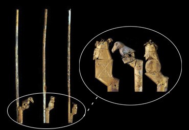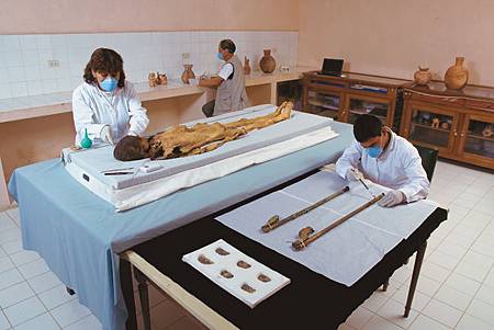 這具木乃伊能保存得如此完好,除了因埋葬地點本身乾燥外,部份歸功於硃砂的使用,因為它能抑制皮膚及組織分解。墓中出土了黃金、銅及半寶石製的頭飾、鼻環(圖四)、項鍊(圖五)及儀式中獵鹿的鍍銅木製矛投擲器(spear throwers。圖六),另有縫紉用的金針、編織工具、綿及陶製品等。鼻環不僅僅是裝飾品,還具宗教意義;它的大小會蓋到嘴巴,並賦予任何通過嘴巴的東西神性,其中兩件還刻意放到她口中。武器的出土可能表示Lady of Cao也是位戰士,或者只是象徵權力的器具。