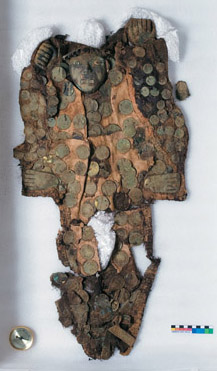 Lady of Cao的墓旁還有數個墓葬,埋著陪伴她到來世的人;其中一座墓還出土一件以皮革及織品製成並飾有羽毛的外套,上面呈現一張表情豐富的銅臉,臉的眼睛及嘴巴還鑲嵌細緻的珠母貝。(圖七)類似的物件曾出土在同屬莫希文化的月亮神殿(Huaca de la Luna)裡,這被認為與薩滿文化相關。